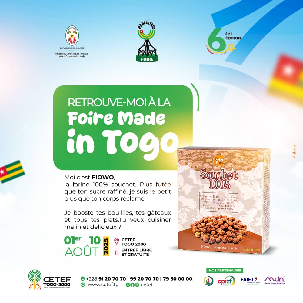 Un produit riche en fibres avec un goût noisetté et naturellement sucré, bon pour petits et grands, FIOWO s’invite dans vos habitudes culinaires. Investissez dans votre santé à travers une alimentation saine à la Foire Made In Togo en devenant consommateurs de FIOWO. Votre pack n’attend plus que vous au CETEF TOGO 2000 du 1er […]