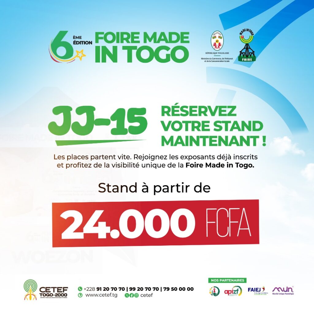 Vous êtes producteur ou entrepreneur togolais ? C’est le moment ou jamais de briller ! Réservez votre stand à partir de 24.000 FCFA et boostez votre visibilité auprès de milliers de visiteurs et partenaires ! Réservez MAINTENANT et faites briller le Made in Togo 🇹🇬 6ème Foire Made in TOGO, du 1er au 10 août […]